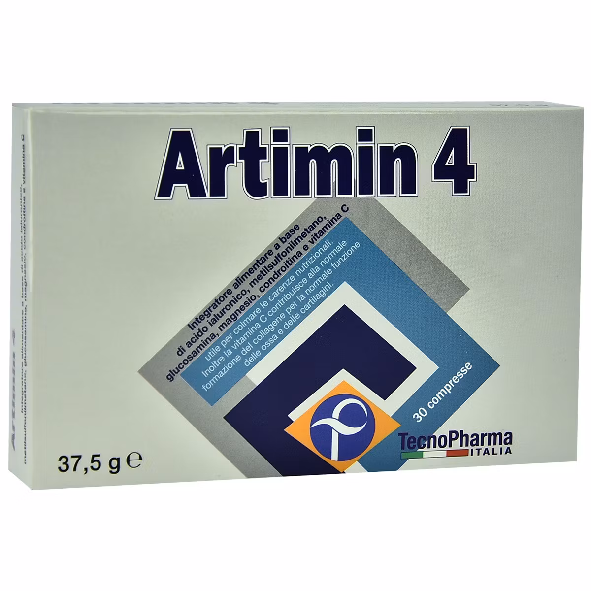 Artimin 4 është një suplement me proteina, minerale dhe vitamina që përdoren për të plotësuar nevojat ushqyese të kockave dhe kartilagjeve. Glukozamina dhe Kondroitina janë përbërësit natyral të ndërtimit të kartilagjeve. Vitamina C ka veti antioksiduese dhe kontribuon në formimin e kolagjenit. Acidi hialuronik hidraton dhe mbron indet. Magnezi ndikon në mirëfunksionimin e kockave dhe muskujve.