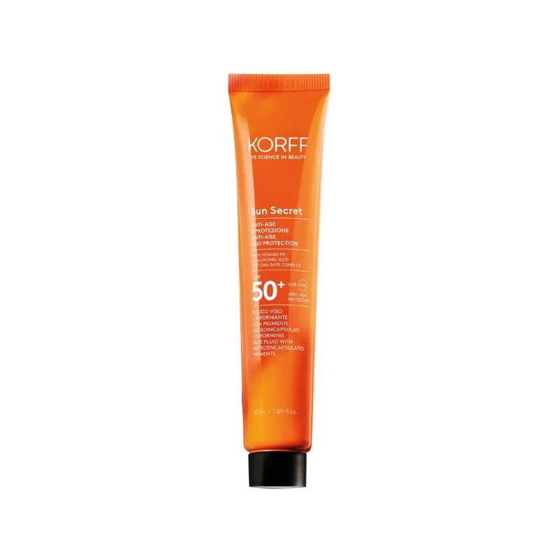 Korff Sun Secret Anti-Age and Protection me SPF 50+ është një krem-xhel për fytyrën për mbrojtje nga ekspozimi në diell, i freskët, i butë dhe i lehtë për tu aplikuar. I formuluar me kompleks filtrash fizik dhe kimik, siguron mbrojtje ndaj rrezeve UVA/UVB. Garanton rehati dhe hidratim të lëkurës së ekspozuar në diell. Mbron gjithashtu lëkurën nga plakja e parakohshme. Ka një nuancë të errët e cila përshtatet me lëkurat me tonalitet të errët për një pamje sa më nayrale.
