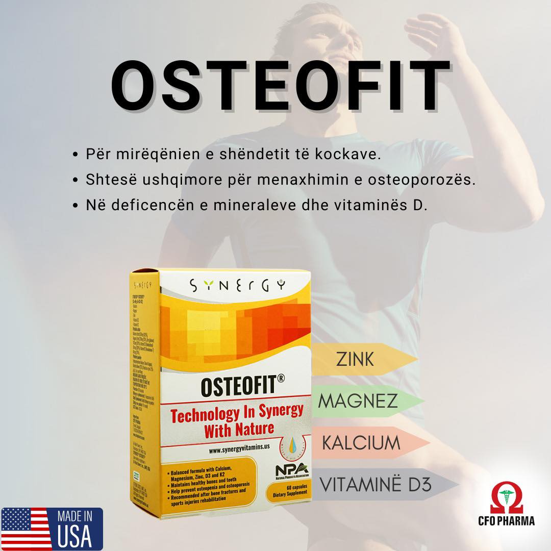 Osteofit (Ca-Mg-Zn-D3-K2) është një suplement ushqimor me vitamina dhe minerale të nevojshme për forcimin e kockave. Parandalon osteoporozën dhe frakturat. Kalçiumi, Magnezi dhe Vitamina D3, ndihmojnë në mirëmbajtjen e kockave dhe dhëmbëve, funksionin normal të sistemit imunitar, të muskujve dhe rritje të shëndetshme. Zinku mbron qelizat nga stresi oksidativ. Vitamina K ndihmon në koagulimin e gjakut.